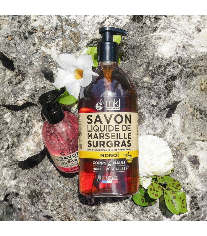 Bottle : 1L Our extra-rich Marseille soap with monoi will transport you with its deliciously exotic fragrance. It gently cleanses skin and can be used regularly. Vegan. Made in France. 100% plant oils.